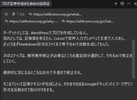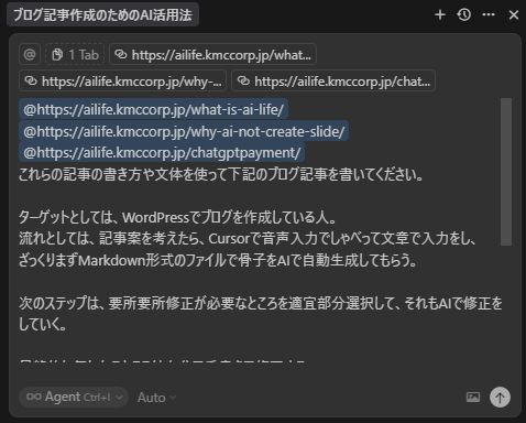 ちなみに、過去の自分のブログ記事を参照して、文体を同じように書くよう指定できるのもCursorのいいところです。