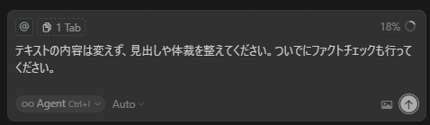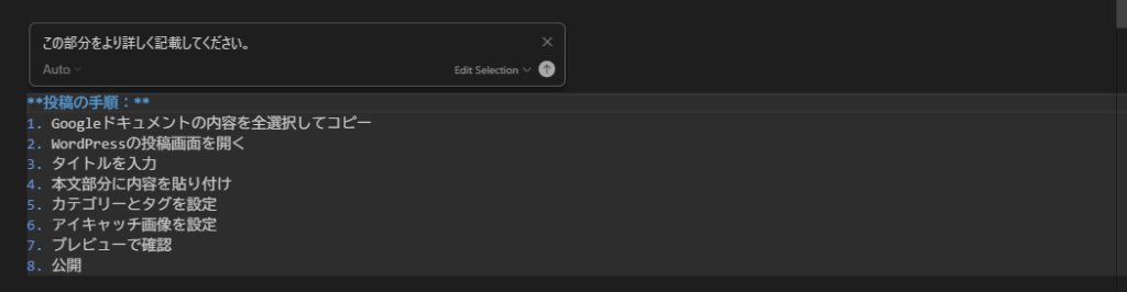 文章作成や編集ができるツールはCursor以外にもたくさん存在しますが、「部分選択して、その部分だけAIにプロンプトを投げて修正できる」という体験は、Cursorならではの使いやすさがあります。