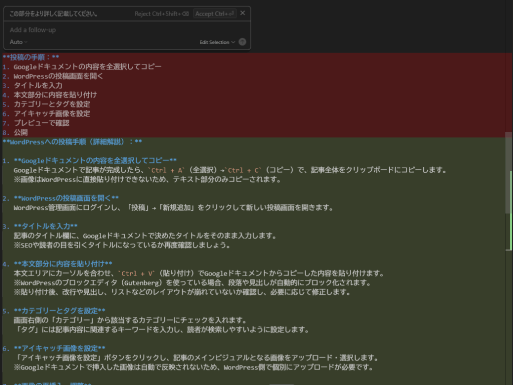 他のエディタやAIツールでも部分修正は可能ですが、「DIFF表示で修正点が明確」「部分選択→AI修正→即座に比較」という流れがとてもスムーズなので、記事作成やリライト作業においてCursorは非常におすすめです。