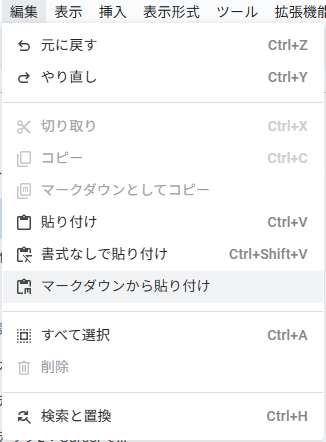 - 「編集」メニューから「マークダウンで貼り付け」を選択