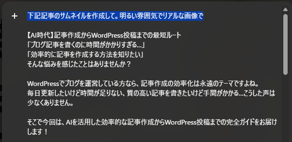 記事を作りながら並行してSoraで「下記記事のサムネイルを作成して。明るい雰囲気でリアルな画像で」など適当なプロンプトを投げ、その下にそのまま記事内容をコピペするだけで、良い感じのサムネイル画像を生成してくれます。