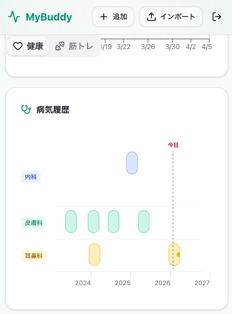 - 疾患管理: 病歴のタイムライン。通院・処方・症状の経過を一覧