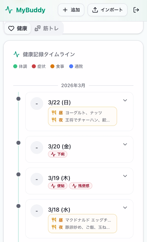 - 健康タイムライン: 体調・症状・食事・通院の記録を時系列で表示