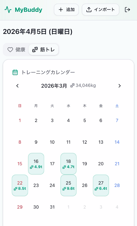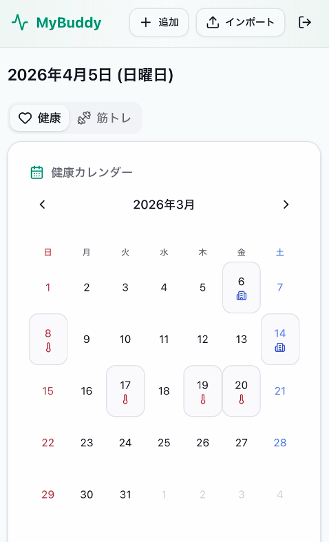 - カレンダー表示: 月間カレンダーで記録のある日を色分け表示