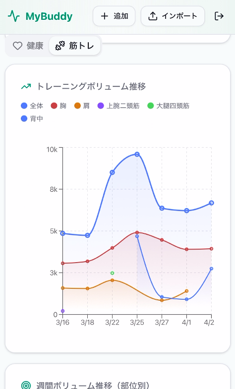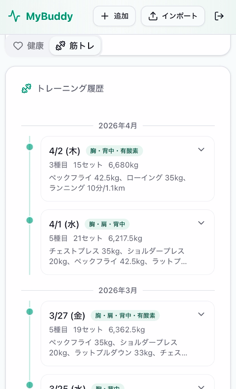 - 筋トレタイムライン: ワークアウト記録を種目・セット単位で表示。ボリューム推移チャート付き