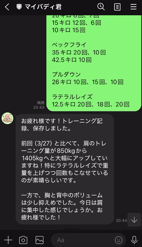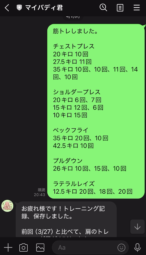 「チェストプレス 30kg×10を3セットやった」