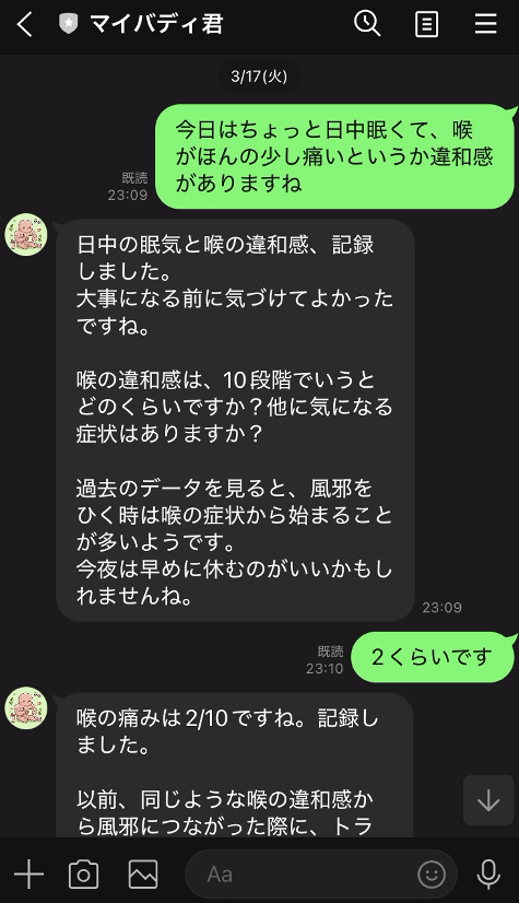 AIは過去のデータを横断的に参照して、症状報告時に「前回同じ症状が出たのは3/8で、その時は花粉が多い日だった」のようなデータに基づくアドバイスも行います。