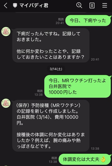 - 排便: 「今日のお通じは普通」→ 状態(普通・軟便・硬便・下痢)を記録