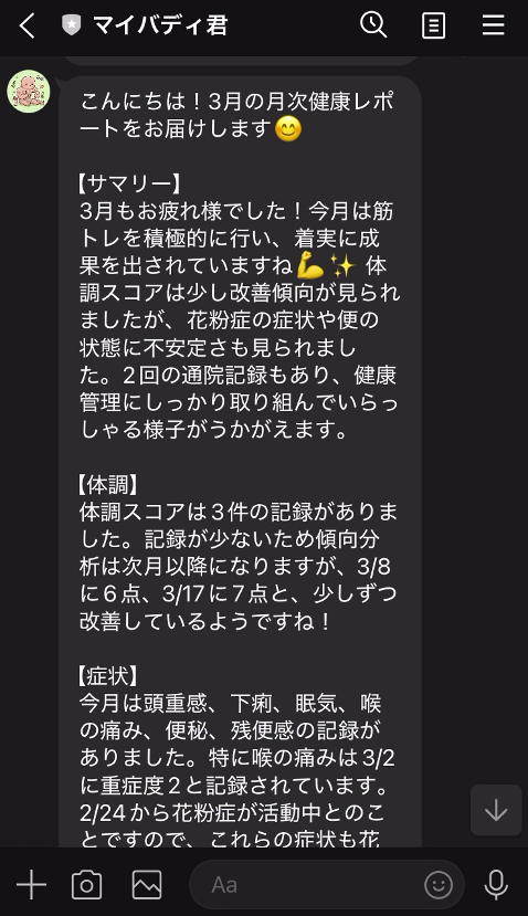 毎月自動でレポートがLINEに届きます。自分では気づかなかった体調のパターンや、筋トレの成長を振り返れます。